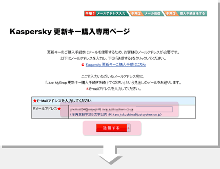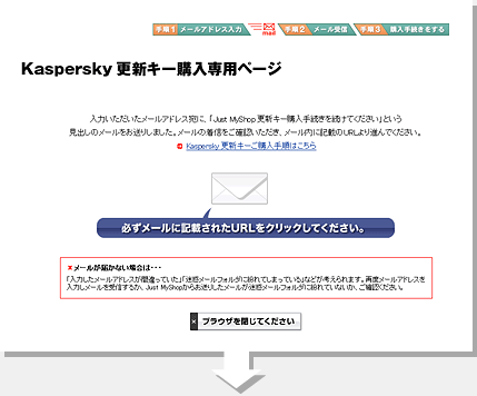 ご入力いただいたメールアドレス宛に、「Just MyShop更新キー購入手続きを続けてください」という見出しのメールをお送りしていますので、メールソフトでご確認ください。 |