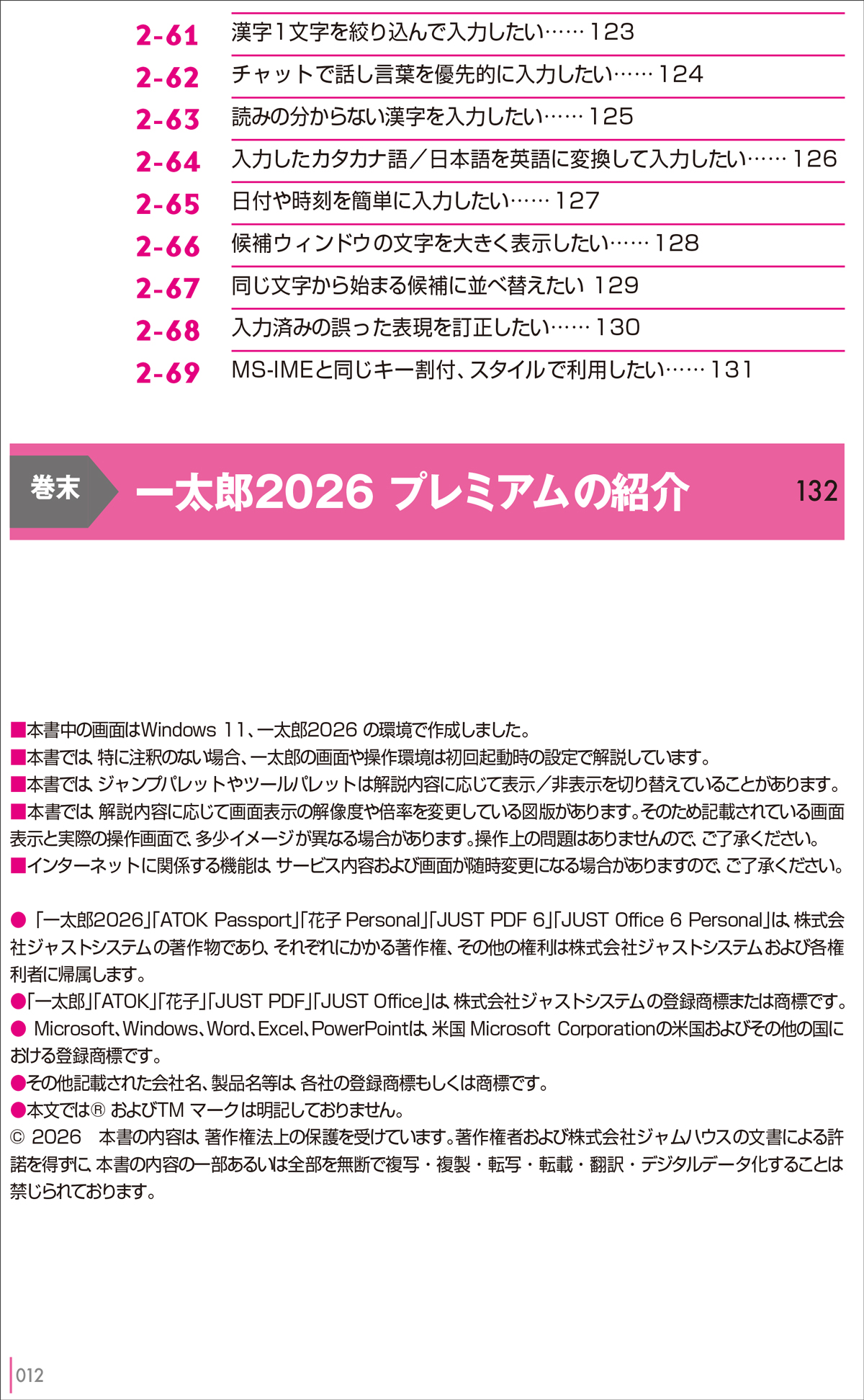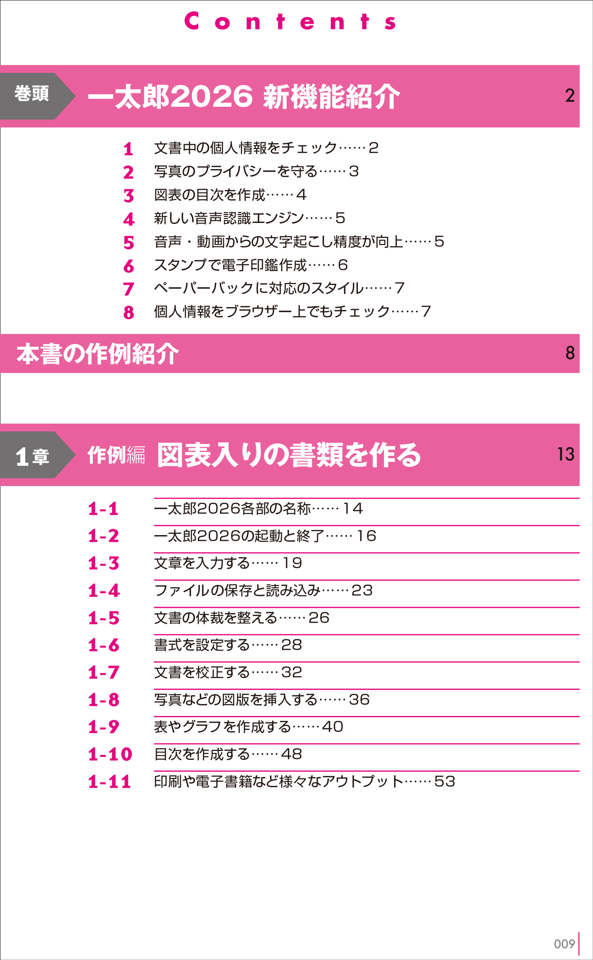 巻頭:一太郎2026 新機能紹介 1章:[作例編]図表入りの書類を作る 2章:[リファレンス編]一太郎2026を使いこなそう 巻末:「一太郎2026 プラチナ」の注目機能 |
