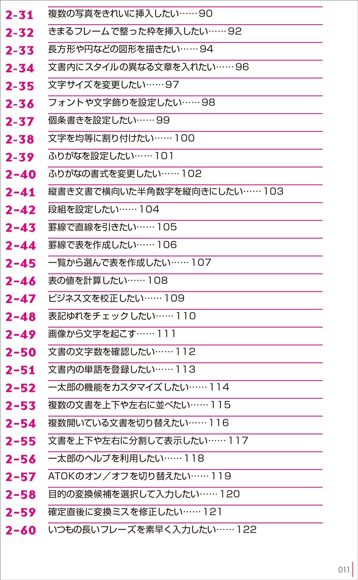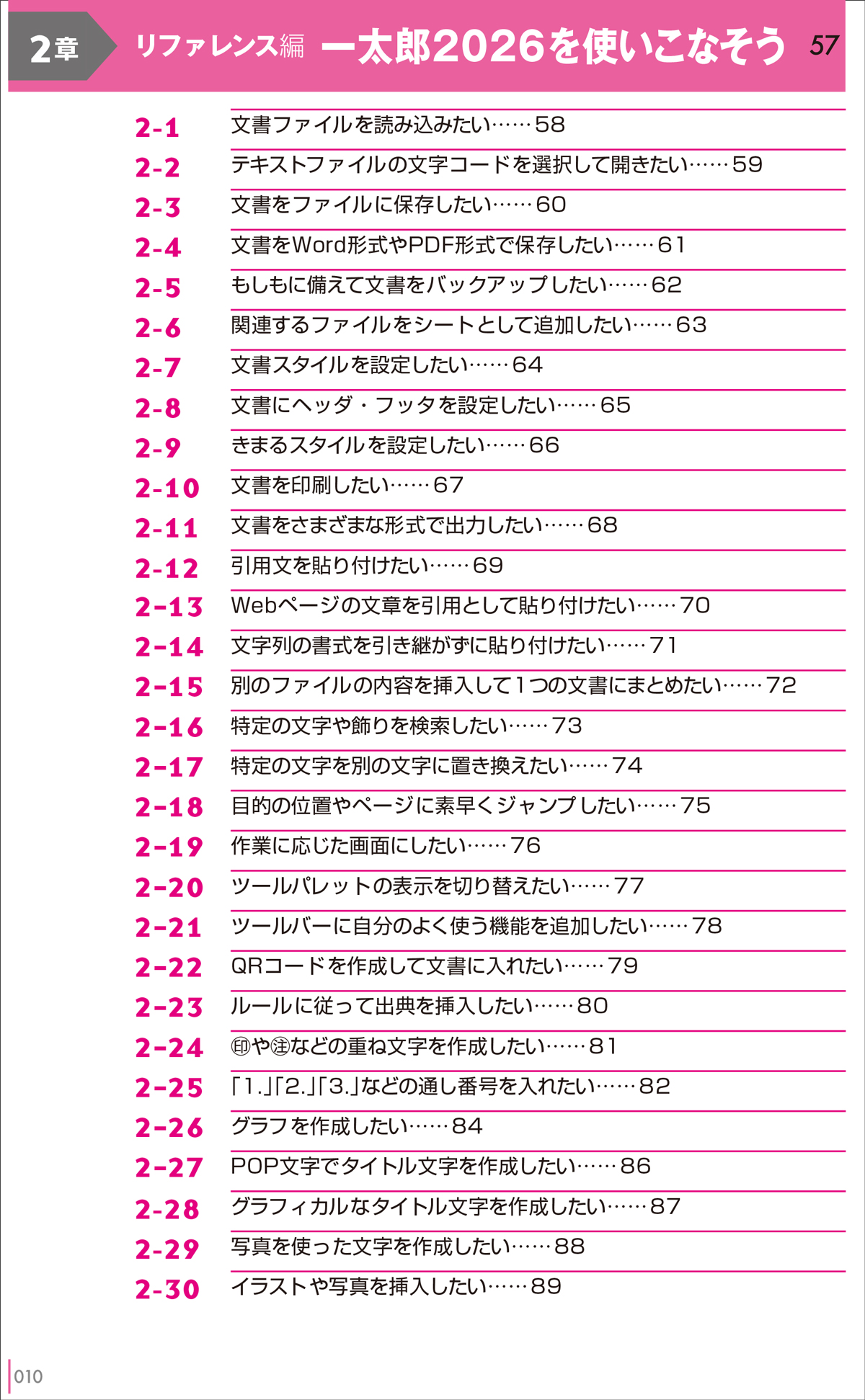 本商品の第2章「リファレンス編 一太郎2026を使いこなそう」では、一太郎を使用して文書作成を行っている際に、逆引きしやすい項目立てになっています。