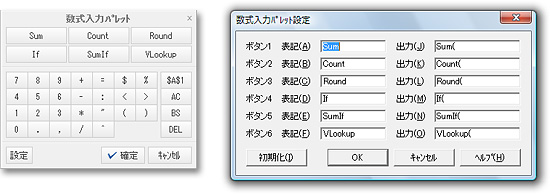 | 演算子や「Sum」「If」「VLookup」「Round」など使用頻度の高い関数を、マウスでさっと入力。便利な「数式入力パレット」を搭載しました。ボタンに割り付ける関数は、自分がよく使うものを選んでカスタマイズすることができます。 |