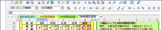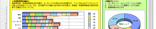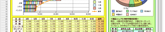 | Excel 2007形式(.xlsx)ファイルのグラフ枠に対応。読み込み、保存ともに可能になりました。 セル内改行機能も、xlsファイル、xlsxファイルともに対応しました。 |