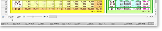 | ツールボックスのフォント、フォントサイズ、文字属性、セルの背景色のリストで、各選択肢の上にマウスカーソルを置くだけで、その属性をリアルタイムにシートに反映し、実行結果をプレビューできるようになりました。コマンド実行後に設定し直すなどの無駄が省け、文書作成の効率が向上します。 |