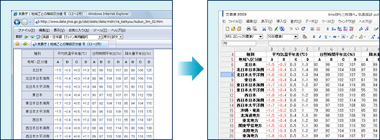 | Internet Explorerなどのブラウザ上でコピーしたHTMLフォーマットのデータを三四郎上に貼り付けることが可能となりました。ブラウザに表示された表やリンクを簡単な操作で三四郎上に再現できます。 |